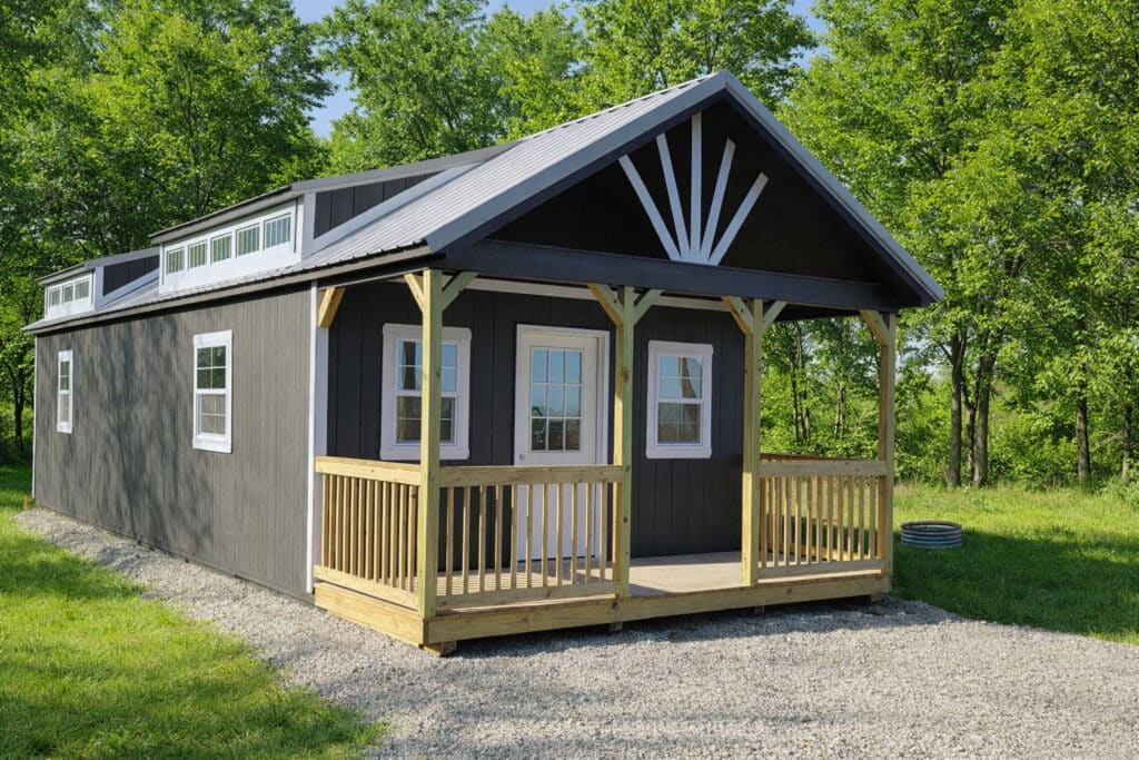 An open cathedral design and a dormer give this cabin a nice open and roomy feel! Sleep in style with the Swiss Cabin!