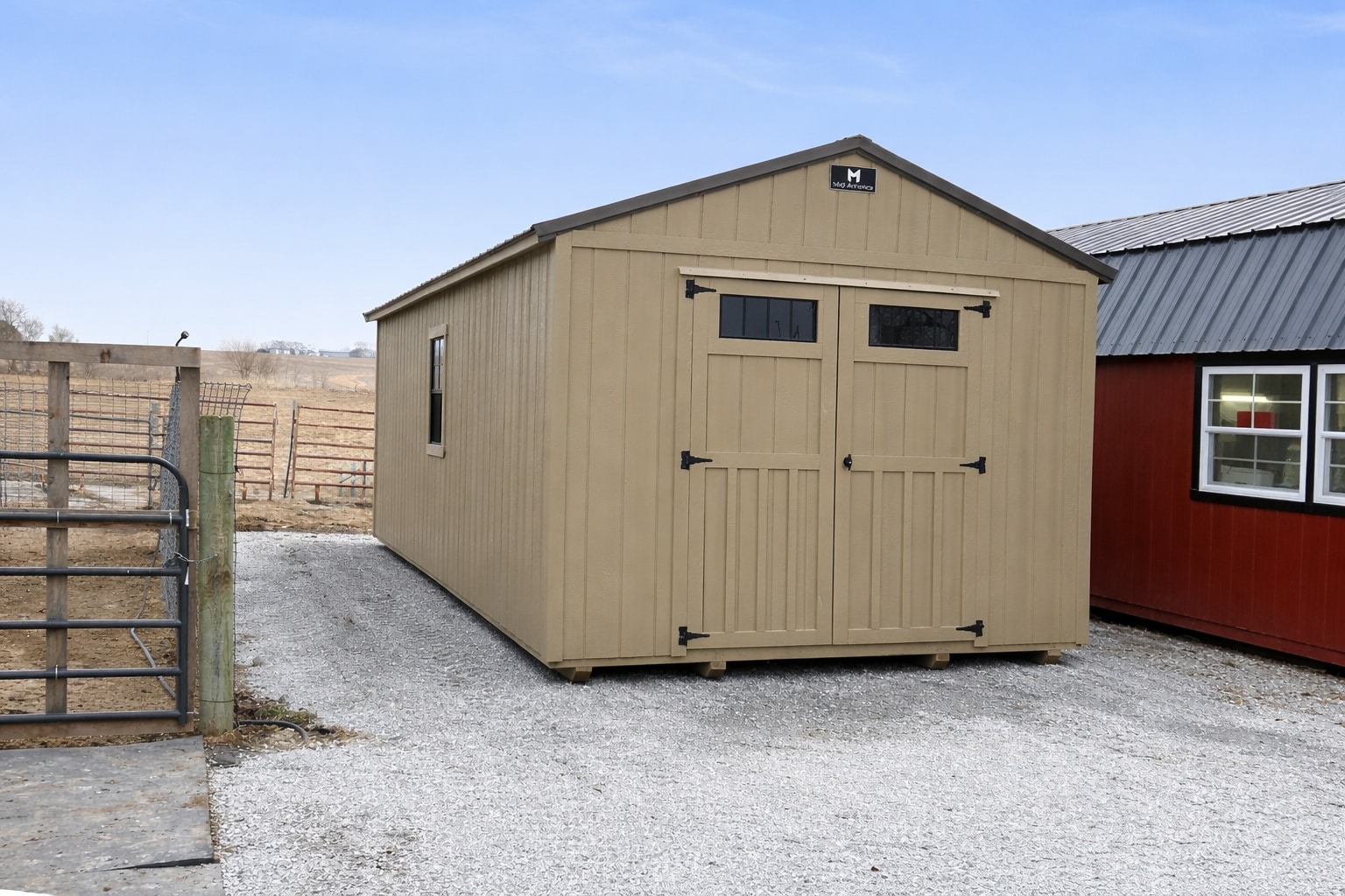A 12×24 Lofted Utility gave her the room and the organization to make it work. Khaki painted siding and a burnished slate metal roof give it a warm, understated look that sits naturally in a residential setting. Black windows sharpen up the exterior details without overdoing it. A workbench and pegboard at the back give her a dedicated workspace where tools and supplies stay organized and within reach. Dual lofts keep inventory and seasonal materials overhead so the main floor stays clear for the work at hand. Creative Backyards worked through the details and Mid-America Structures built and delivered it. Chantelle now has 288 square feet of purpose-built crafting and storage space in Greenwood, Nebraska built around her business.